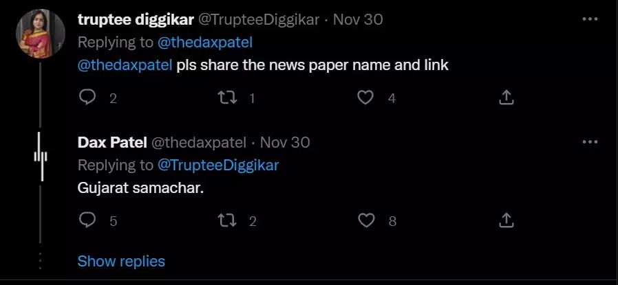 કેટલાક યુઝર્સ વાયરલ પોસ્ટ શેર કરતા સાથે દાવો કરી રહ્યા હતા કે આ ન્યુઝ ‘ગુજરાત સમાચાર’ દ્વારા પ્રકાશિત કરવામાં આવેલ છે. જે અંગે અમે ન્યુઝ સંસ્થાન ગુજરાત સમાચારનો સંપર્ક કર્યો હતો તેઓ જણાવ્યું કે “આ કટિંગ ફેક છે, ‘ગુજરાત સમાચાર’ દ્વારા કોઈ પણ એડિશનમાં આ પ્રકારના સમાચાર પ્રકાશિત કરવામાં આવેલ નથી”