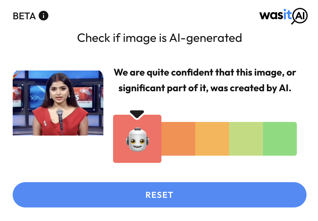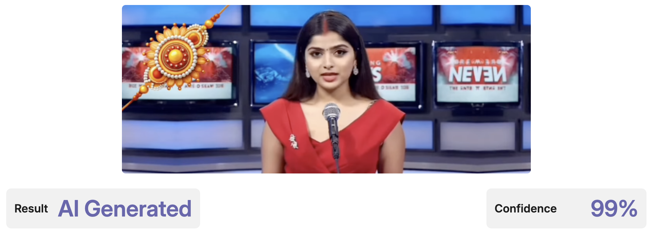 વીડિયોની તપાસ કરતા તેમાં જે યુવતી ન્યૂઝ ઍન્કર તરીકે દેખાય છે, તેની પાછળનું બૅકગ્રાઉન્ડનું લખાણ શંકાસ્પદ જણાયું. જેથી વીડિયો ક્લિપના તે ભાગના કીફ્રેમ્સને એઆઈ ડિટેક્શન ટૂલ થકી ચકાસ્યા.