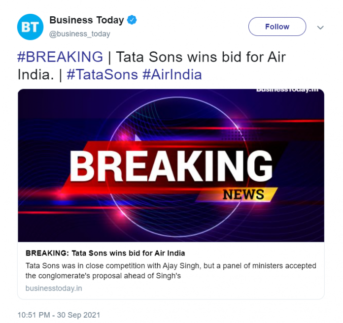 ટાટા ગ્રુપે સૌથી ઉંચી બોલી લગાવીને એર ઇન્ડિયા ખરીદી લીધું હોવાના દાવા સાથે પ્રકાશિત કરવામાં આવેલ મીડિયા અહેવાલ અને સોશ્યલ મીડિયા પોસ્ટ ભ્રામક છે. રોકાણ અને જાહેર સંપત્તિ વ્યવસ્થાપન વિભાગ અને મંત્રી પિયુષ ગોયેલ દ્વારા પણ સ્પષ્ટતા કરતા જણાવવામાં આવ્યું છે કે સરકાર દ્વારા ફાઇનલ બિડરનું નામ નક્કી કરવામાં આવ્યું નથી. તમામ મીડિયા અહેવાલો ટાટા સન્સની બીડ ફાઇનલ કરવામાં આવી હોવાનો ભ્રામક દાવો કરી રહ્યા છે.