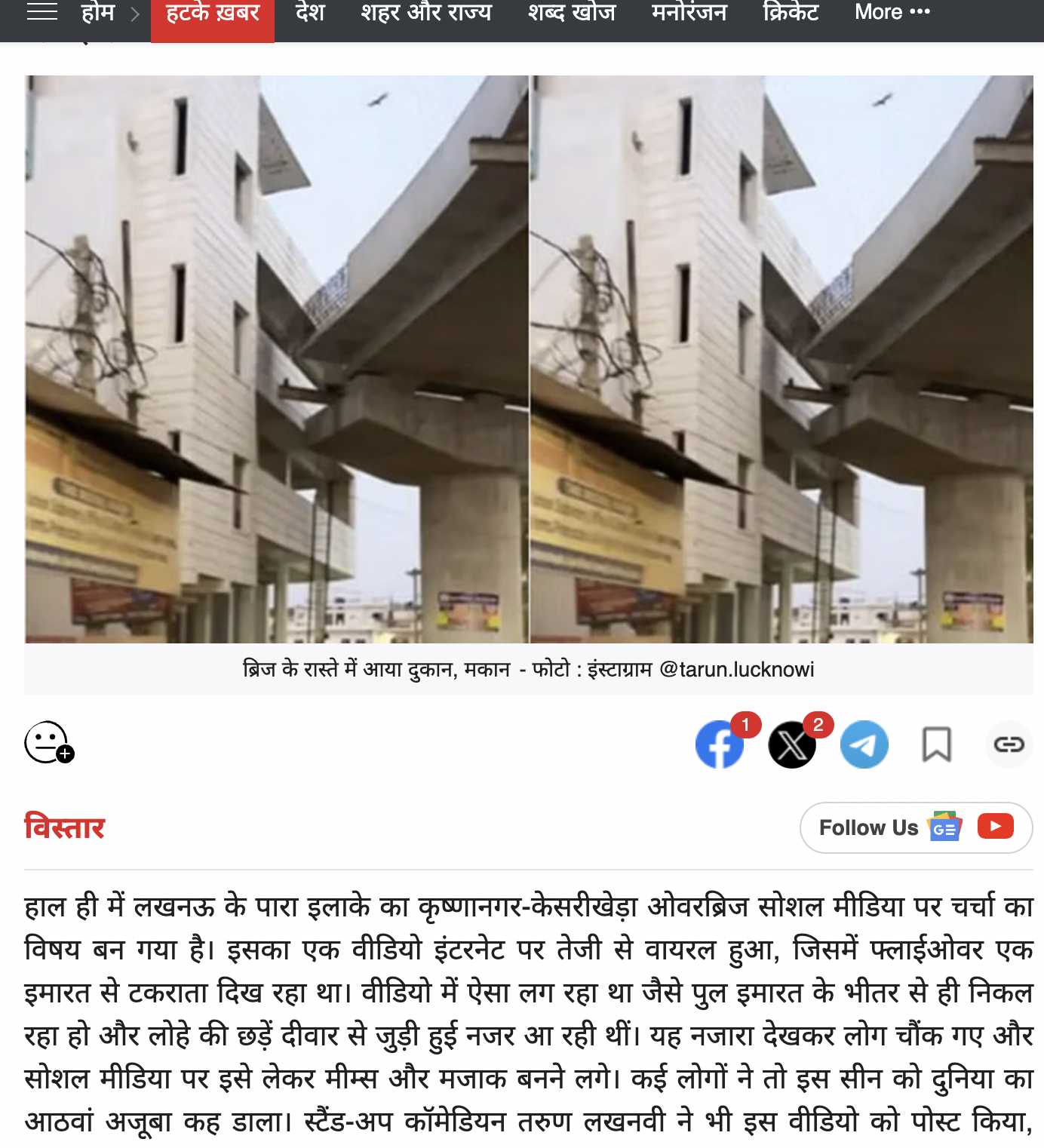 3 જુલાઈ-2025ના રોજ અમર ઉજાલા દ્વારા પ્રકાશિત અહેવાલ પ્રાપ્ત થયો. અહેવાલનું શીર્ષક છે કે – બિલ્ડિંગની અંદર ઘૂસ્યો આલિશાન બ્રિજ, કામ રોકવામાં આવ્યું.