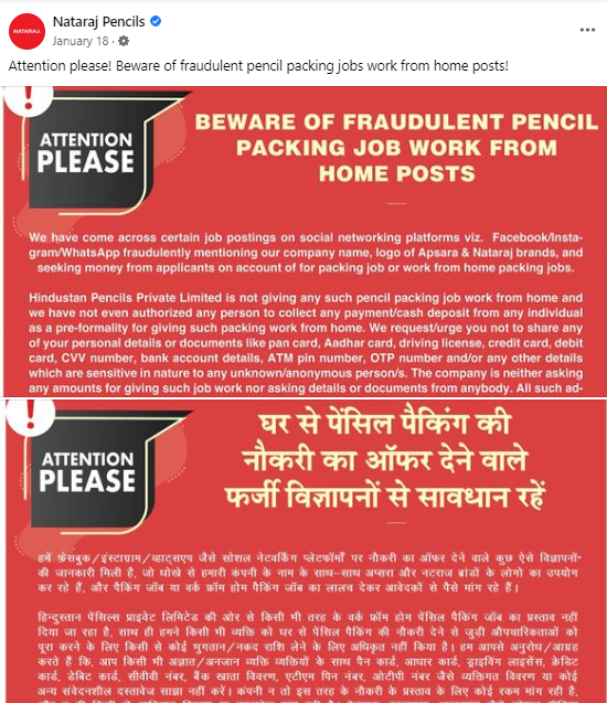 આ સિવાય નટરાજ પેન્સિલે 18 જાન્યુઆરી, 2022ના રોજ એક નિવેદન જાહેર કરતા કહ્યું કે, ‘હિન્દુસ્તાન પેન્સિલ્સ પ્રાઈવેટ લિમિટેડ કંપની ઘરેથી પેન્સિલ કે પેન પેકિંગ માટે નોકરી આપતી નથી. તેમજ નટરાજ પેન્સિલ વિનંતી કરે છે કે તમારી અંગત વિગતો અથવા દસ્તાવેજો જેમ કે PAN કાર્ડ, આધાર કાર્ડ, ડ્રાઇવિંગ લાઇસન્સ, ક્રેડિટ કાર્ડ, ડેબિટ કાર્ડ, CVV નંબર, બેંક ખાતાની વિગતો, ATM PIN નંબર, OTP નંબર અને/અથવા કોઈપણ અન્ય વિગતો કોઈની સાથે શેર કરશો નહીં.