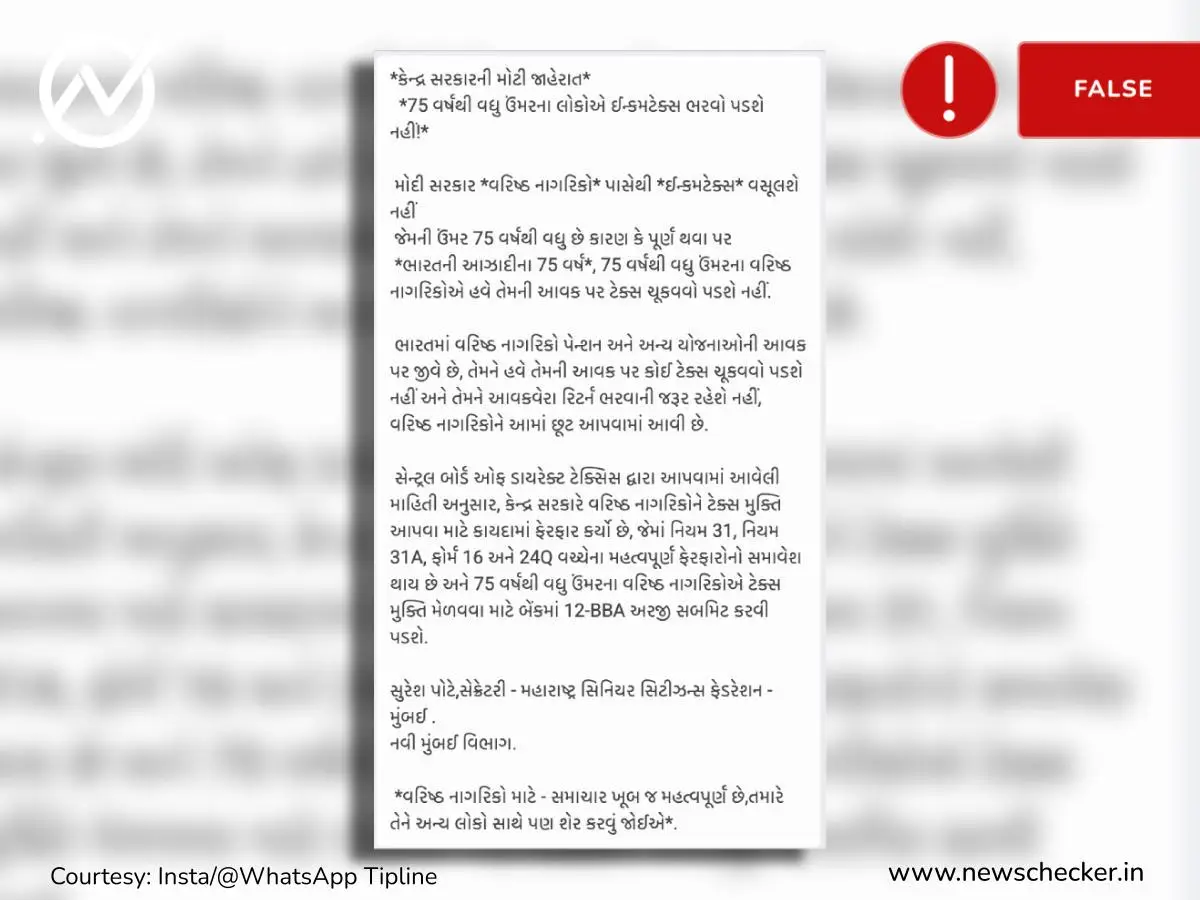 સોશિયલ મીડિયામાં દાવો વાઇરલ થયો કે, ભારતની આઝાદીના 75 વર્ષ પૂર્ણ થવા પર, 75 વર્ષથી વધુ ઉંમરના વરિષ્ઠ નાગરિકોએ હવે તેમની આવક પર કર ચૂકવવો પડશે નહીં. જોકે, આ દાવો ખોટો પુરવાર થયો છે. અહેવાલ વાંચવા અહીં ક્લિક કરો.