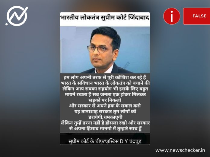 ચીફ જસ્ટિસ ઓફ ઈન્ડિયા ડીવાય ચંદ્રચુડની એક તસ્વીર સોશિયલ મીડિયા પર શેર કરવામાં આવી રહી છે, જેમાં તેમણે લોકોને સરકાર વિરુદ્ધ વિરોધ કરવાની અપીલ કરી છે. ભારતના સંવિધાન અને લોકતંત્રને બચાવવા માટે ડીવાય ચંદ્રચુડ દ્વારા લોકોને વિરોધ કરવાની અપીલ કરી રહ્યા હોવાનો દાવો કરવામાં આવ્યો છે.
