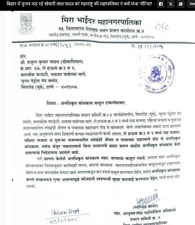 गौरतलब है कि बिहार की छपरा सीट से आरजेडी के टिकट पर विधानसभा चुनाव लड़ रहे भोजपुरी अभिनेता खेसारी लाल यादव को बीते 3 नवंबर को मीरा भायंदर महानगरपालिका ने उनके मीरा रोड स्थित बंगले में हुए अवैध निर्माण को हटाने के लिए नोटिस भेजा था। इसके बाद सोशल मीडिया पर इस मुद्दे पर बहस छिड़ गई। इसी सन्दर्भ में यह वीडियो अब शेयर किया जा रहा है।