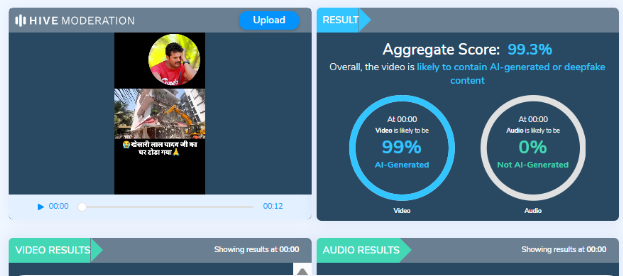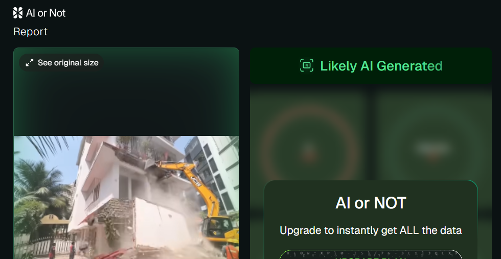 खेसारी लाल यादव के घर पर बुलडोजर चलने के दावे से वायरल इस वीडियो के कीफ्रेम को एक अन्य टूल Aiornot पर भी चेक किया। इस टूल ने भी वीडियो में मौजूद दृश्य के AI से बने होने की संभावना जताई।
