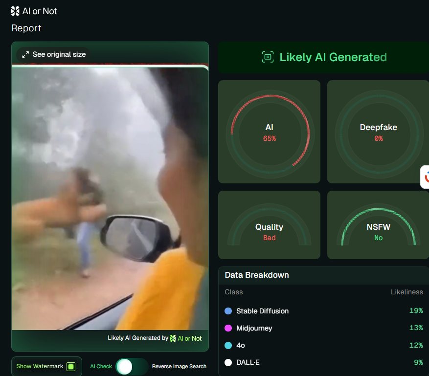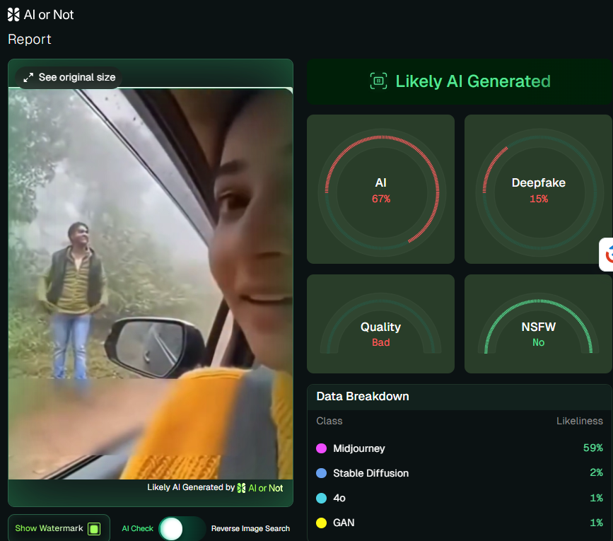 वायरल वीडियो को ध्यान से देखने पर हमें इसमें कुछ विसंगतियां नजर आईं. जैसे कि वीडियो में दिख रही महिला ने कार की विपरीत दिशा में बैठकर सीट बेल्ट लगाया हुआ है. इसके अलावा, कार की स्टीयरिंग बाईं ओर दिख रही है, जो कि भारत में संभव नहीं है. इससे हमें ये शक हुआ कि ये वीडियो एडिटेड या फिर AI जेनरेटेड हो सकता है. हमने मिसइन्फॉर्मेशन कॉम्बैट अलायंस (MCA), अब ट्रस्टेड इन्फॉर्मेशन अलायंस (TIA), का हिस्सा डीपफेक एनालिसिस यूनिट (DAU) की मदद ली, जिसका न्यूज़चेकर भी हिस्सा है. DAU ने वायरल वीडियो और इसके कीफ्रेम्स को कई एआई टूल्स से जांचा.