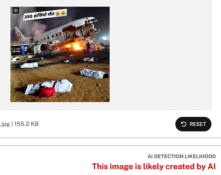 जांच में हमने पाया कि हज यात्रियों को लेकर जा रहे विमान के क्रैश होने का दावा फर्जी है। वायरल तस्वीर AI जनरेटेड है।