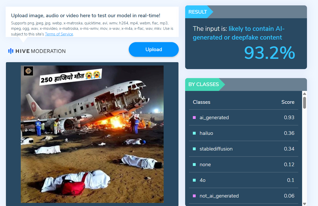 HIVE Moderation टूल ने पाया कि यह तस्वीर 93.2 प्रतिशत AI जनरेटेड है।