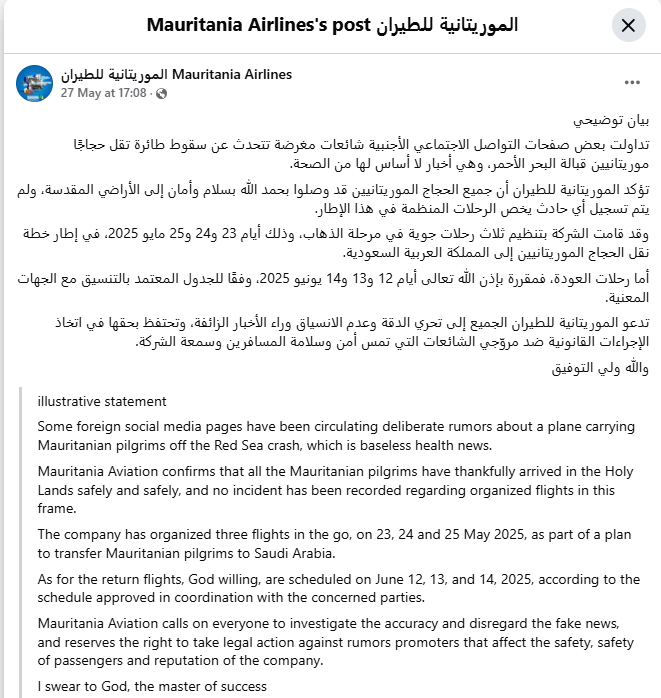 जांच के दौरान हमने पाया कि मॉरीटानिया एयरलाइन्स ने 27 मई 2025 को फेसबुक पोस्ट के जरिये वायरल दावे का खंडन करते हुए लिखा है कि “कुछ विदेशी सोशल मीडिया हैंडल्स यह फ़र्ज़ी खबर फैला रहे हैं कि मॉरीटानिया से हज यात्रियों को ले जा रहा विमान लाल सागर के पास क्रैश हो गया। हालाँकि यह दावा फ़र्ज़ी है।”