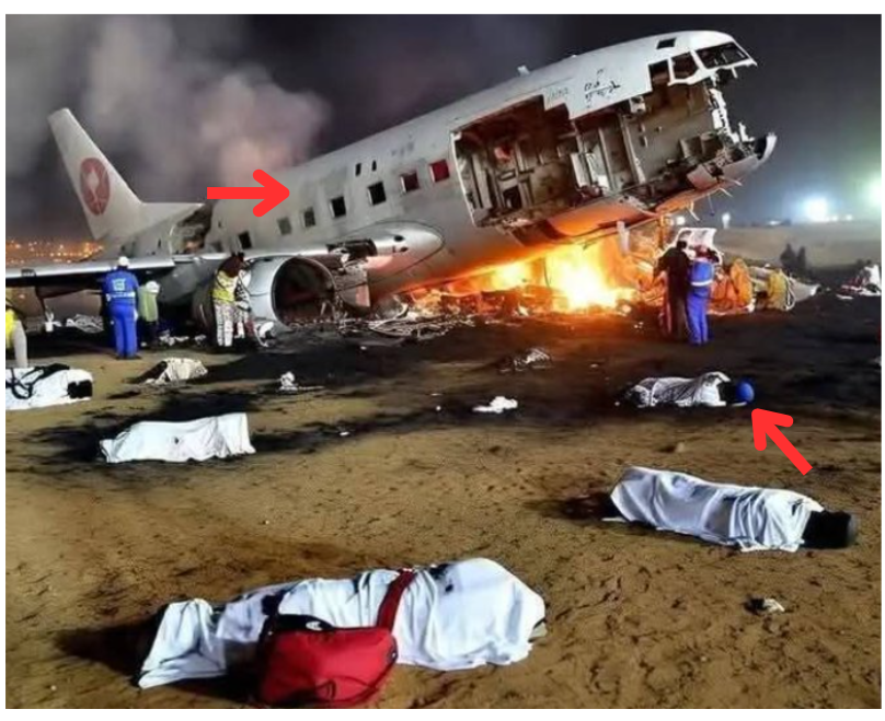 वायरल तस्वीर को गौर से देखने पर हमें इस फोटो में कई कमियां नजर आईं। तस्वीर में विमान की खिड़कियाँ चौकोर नजर आ रही हैं, जो आमतौर पर अंडाकार होती हैं। इसके अलावा, जमीन पर पड़ी दिखाई गई लाशों के सिर पर हेलमेट भी लगा नजर आ रहा है। इन कारणों से हमें इस तस्वीर के AI जनरेटेड होने का शक हुआ।