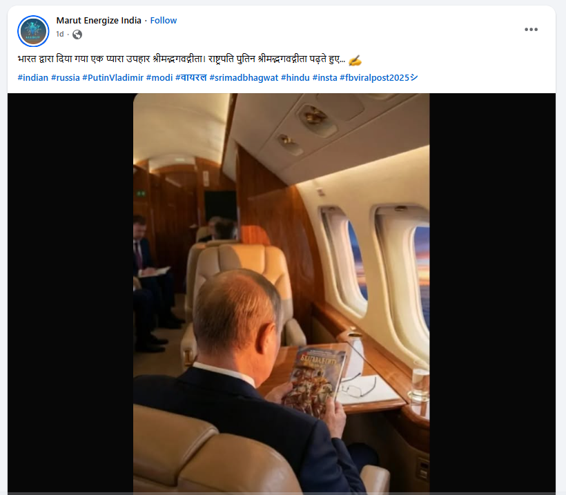 प्लेन में भगवद् गीता पढ़ते व्लादिमीर पुतिन की एक तस्वीर सोशल मीडिया पर वायरल है। दावा किया जा रहा है कि भारत की तरफ से भेंट की गई भगवद् गीता को पुतिन अपने विमान में बैठकर पढ़ रहे हैं। पोस्ट का आर्काइव यहां देखें।