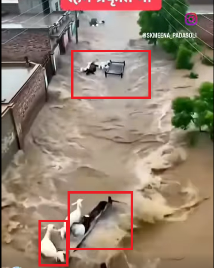 राजस्थान में हुई हालिया बारिश के चलते कई इलाकों में जलभराव जैसी स्थिति पैदा हो गई। फिलहाल राज्य में बारिश का असर कम तो हुआ है, लेकिन कई जगहों पर हुई भारी बारिश के चलते जनहानि की खबरें भी सामने आई हैं। इसी बीच पानी से भरी एक गली में बहते मवेशियों का एक वीडियो सोशल मीडिया पर वायरल है। दावा किया जा रहा है कि यह वीडियो सवाई माधोपुर में आई बाढ़ का है। वीडियो में चारपाई समेत कुछ घरेलू सामान और कई मवेशी तेजी से बहते हुए नजर आ रहे हैं। पोस्ट का आर्काइव यहां देखें।