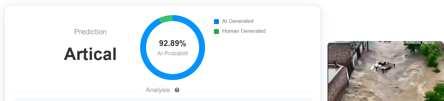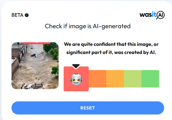 अब हमने वीडियो के कीफ्रेम को AI डिटेक्शन टूल Wasitai पर ढूंढा। इस टूल ने वीडियो में मौजूद दृश्य के AI से बने होने की संभावना जताई।
