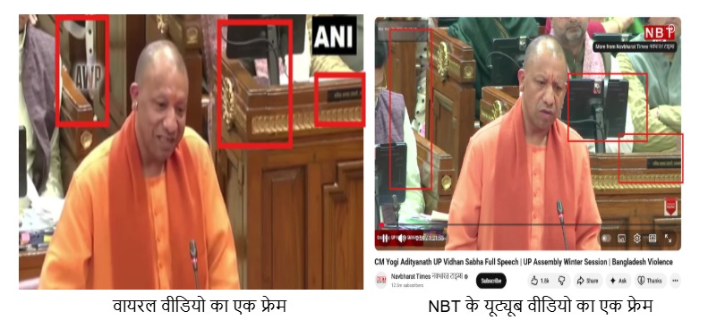 पड़ताल के दौरान हमें नवभारत टाइम्स के यूट्यूब चैनल पर 24 दिंसबर, 2025 को अपलोड किया गया 1 घंटा 21 मिनट 55 सेकेंड का वीडियो मिला. वीडियो रिपोर्ट को ध्यान से देखने पर हमने ये पाया कि योगी आदित्यनाथ ने अपने संबोधन के दौरान वायरल वीडियो से संबंधित कोई बयान नहीं दिया था. इस वीडियो में 59 मिनट से 1 घंटा 3 मिनट के बीच योगी आदित्यनाथ ने बांग्लादेश में हिंदुओं के खिलाफ जारी हिंसा के विषय में बोला, लेकिन उन्होंने बांग्लादेश पर आक्रमण नहीं करने पर पीएम मोदी के पद छोड़ने जैसी कोई बात नहीं की. हमने वायरल वीडियो के एक फ्रेम की तुलना NBT की वीडियो रिपोर्ट में मौजूद एक फ्रेम से की.