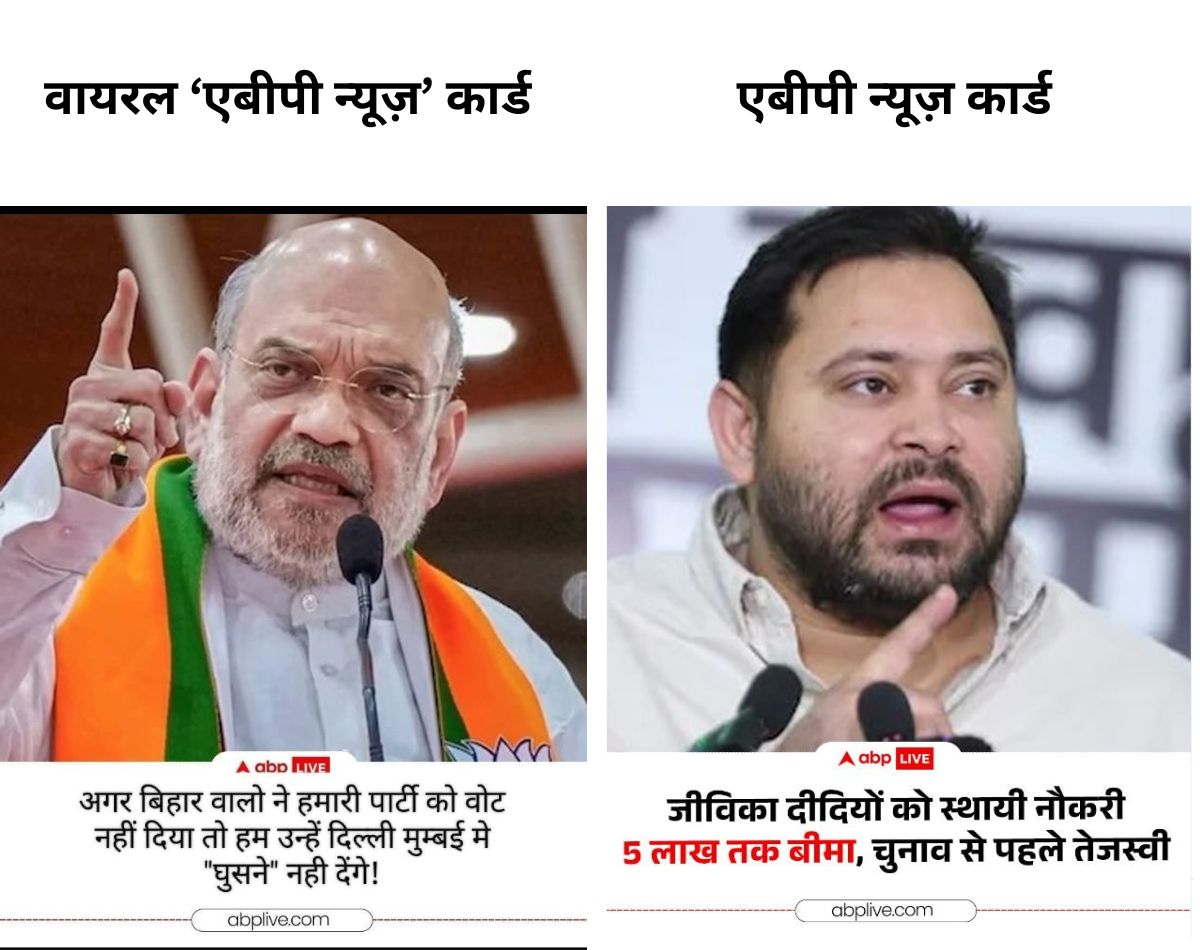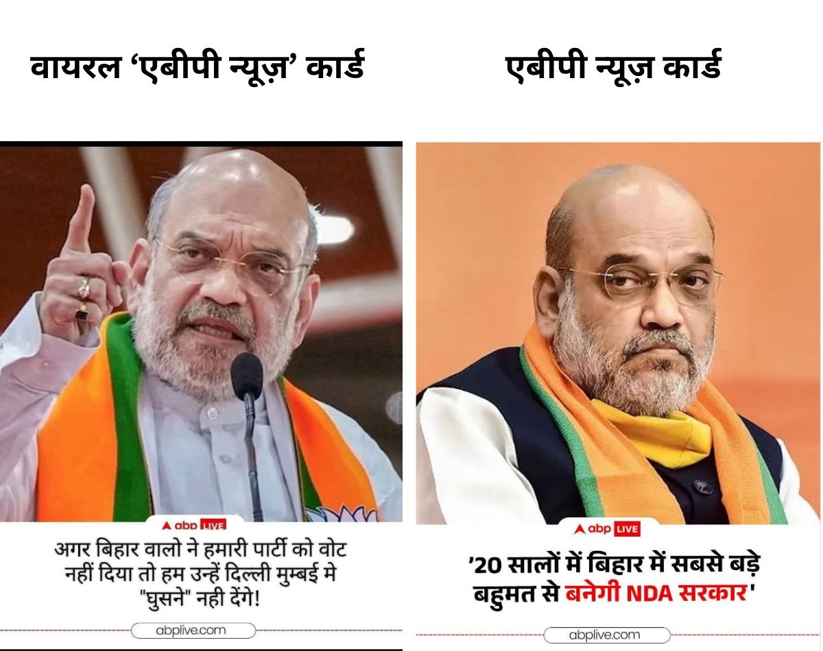 एबीपी न्यूज़ के नाम पर वायरल कार्ड में लिखा है कि गृह मंत्री अमित शाह ने कहा कि अगर बिहार के लोग बीजेपी को वोट नहीं देंगे तो उन्हें दिल्ली और मुंबई में घुसने नहीं दिया जाएगा.
