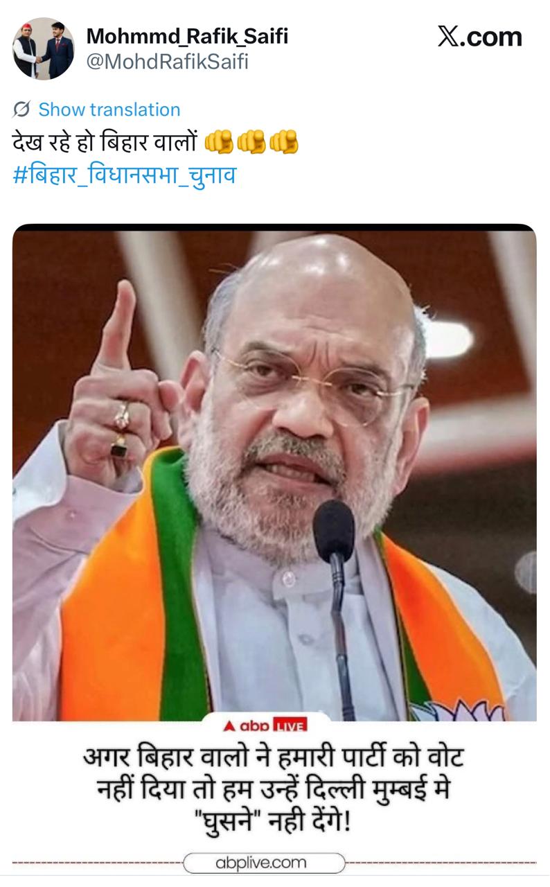वायरल कार्ड में अमित शाह की तस्वीर के साथ यह कथित बयान लिखा है – “अगर बिहार वालों ने हमारी पार्टी को वोट नहीं दिया तो हम उन्हें दिल्ली मुंबई में घुसने नहीं देंगे.” सोशल मीडिया यूज़र्स इस कार्ड को असली मानकर शेयर कर रहे हैं.