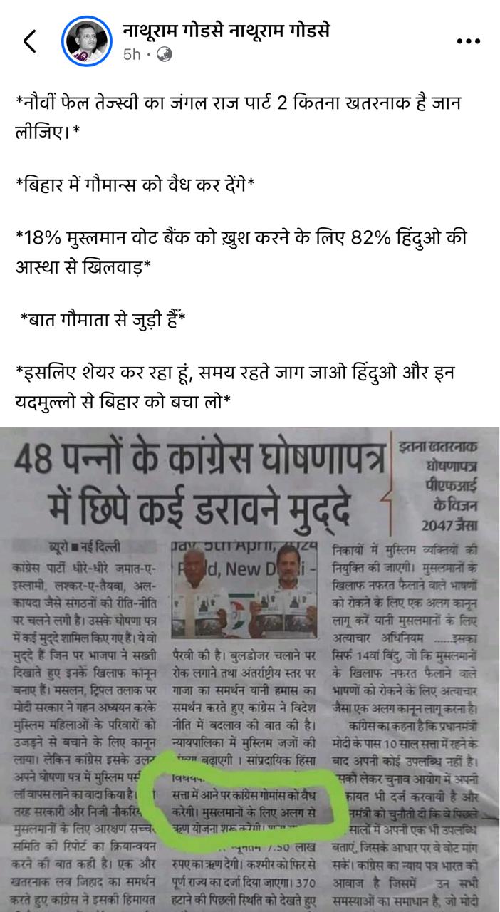 बिहार विधानसभा चुनाव के लिए महागठबंधन ने 28 अक्टूबर को ‘तेजस्वी प्रण’ नाम से घोषणापत्र जारी किया. इसके बाद सोशल मीडिया पर एक अख़बार की न्यूज़ कटिंग के ज़रिए दावा किया जा रहा है कि इस घोषणापत्र में बिहार में गौमांस को वैध करने का वादा किया गया है. वायरल पोस्ट्स में कहा जा रहा है कि मुस्लिम वोट बैंक को खुश करने के लिए हिंदुओं की आस्था से खिलवाड़ किया जा रहा है.