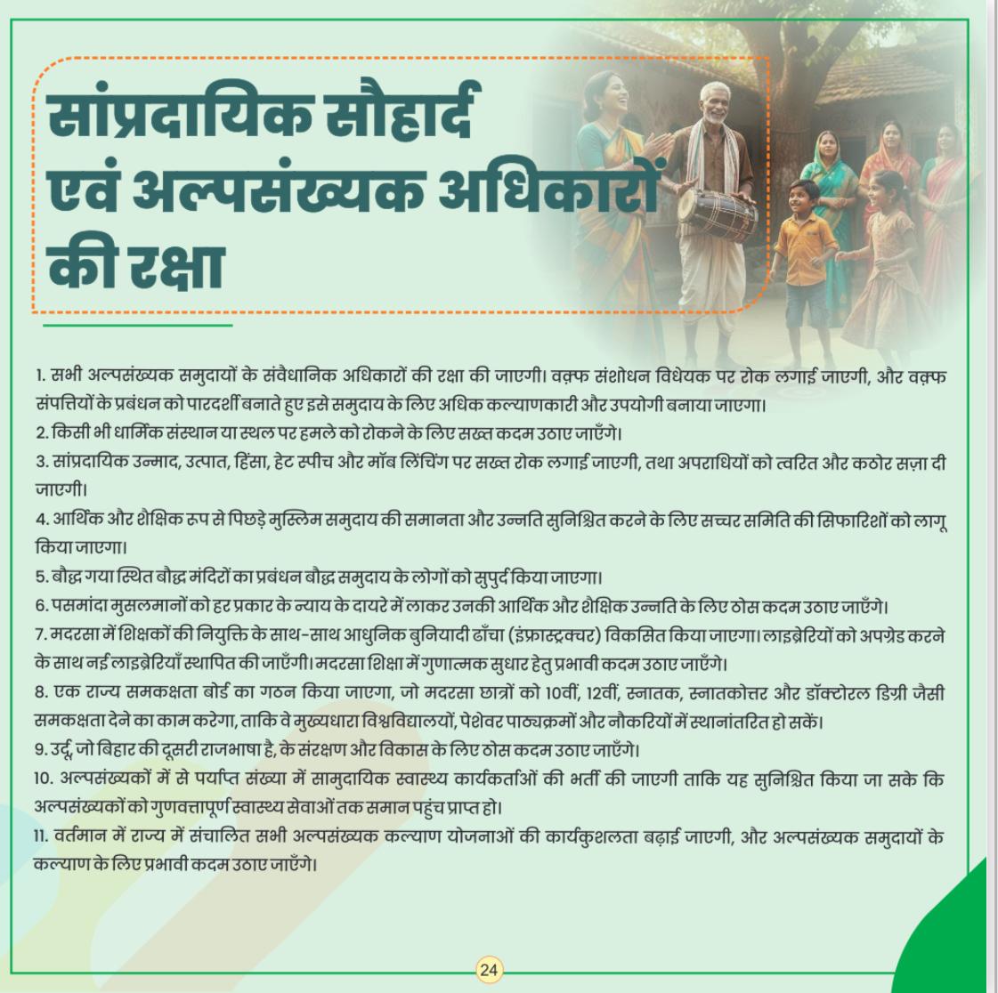 महागठबंधन के घोषणापत्र में ‘सांप्रदायिक सौहार्द एवं अल्पसंख्यक अधिकारों की रक्षा’ के तहत सभी अल्पसंख्यक समुदायों के संवैधानिक अधिकारों की रक्षा करने, वक्फ़ संशोधन विधेयक को स्थगित करने और वक्फ़ संपत्तियों के प्रबंधन को पारदर्शी बनाकर उसे अधिक कल्याणकारी और लाभकारी बनाने का वादा किया गया है.