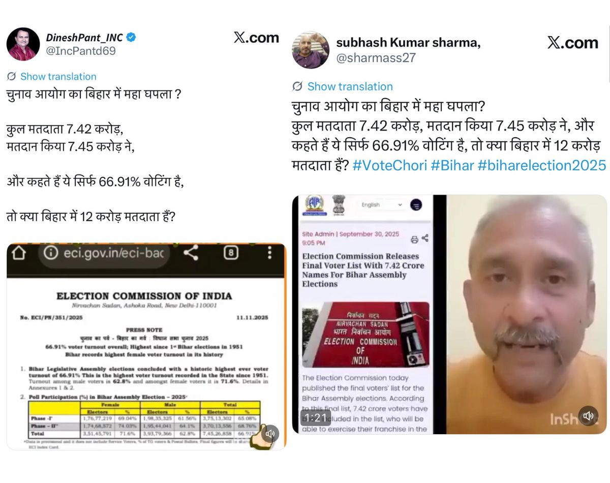 एक्स पर व्यापक रूप से प्रसारित एक पोस्ट में दावा किया गया है, “चुनाव आयोग का बिहार में महा घपला? कुल मतदाता 7.42 करोड़, मतदान किया 7.45 करोड़ ने, और कहते हैं ये सिर्फ 66.91% वोटिंग है, तो क्या बिहार में 12 करोड़ मतदाता हैं? #VoteChori #Bihar #biharelection2025” पोस्ट का आर्काइव यहां देखें.