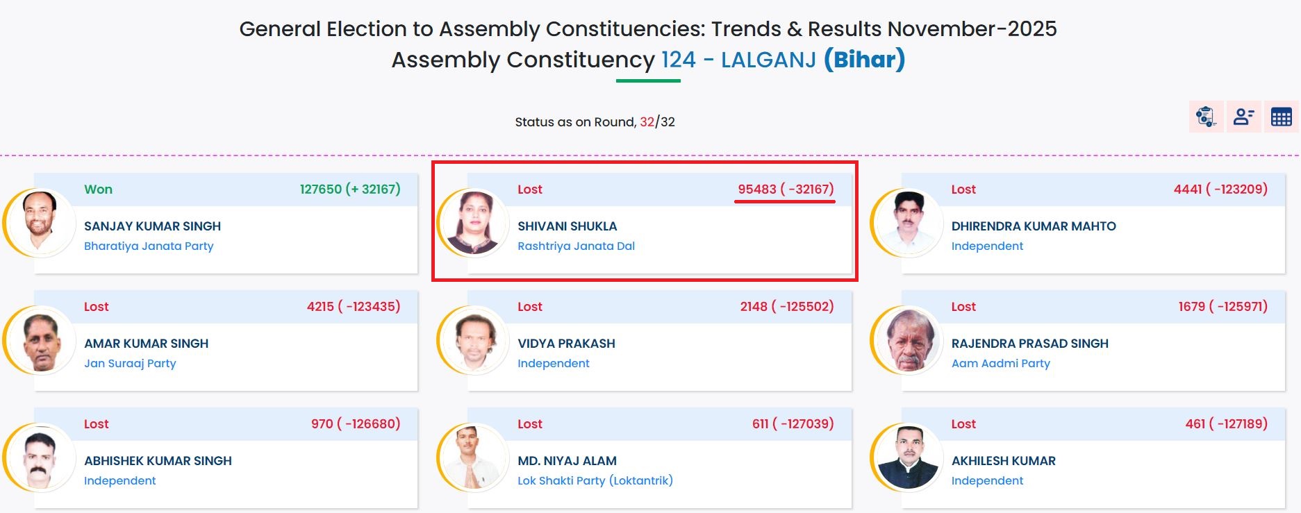 हालांकि, वायरल दावा ग़लत है. वीडियो में दिख रही महिला कोई निर्दलीय उम्मीदवार नहीं, बल्कि लालगंज विधानसभा सीट से आरजेडी उम्मीदवार रहीं शिवानी शुक्ला हैं, जिन्हें लगभग 95 हज़ार वोट मिले थे.
