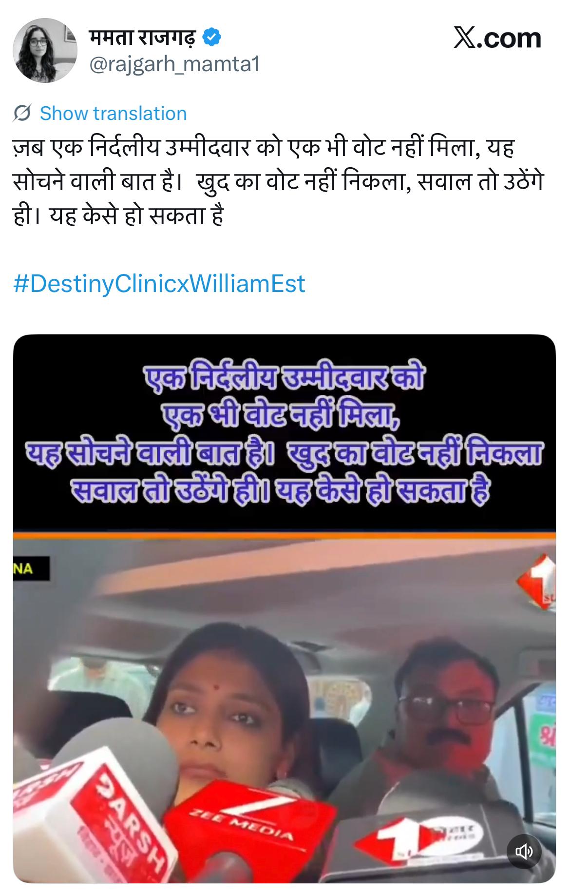एक्स पर एक यूज़र ने वीडियो पोस्ट करते हुए लिखा, “ज़ब एक निर्दलीय उम्मीदवार को एक भी वोट नहीं मिला, यह सोचने वाली बात है. खुद का वोट नहीं निकला, सवाल तो उठेंगे ही. यह केसे हो सकता है.” पोस्ट का आर्काइव यहां देखें.
