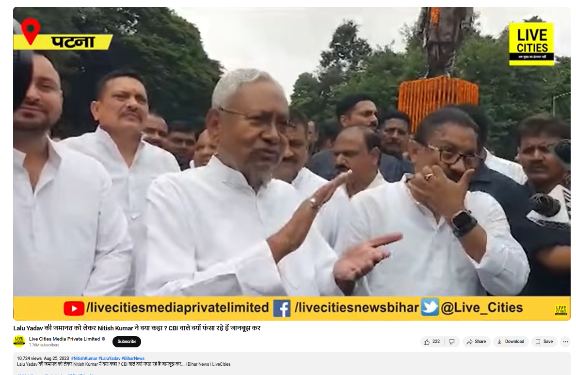 लालू यादव को लेकर नीतीश कुमार द्वारा भाजपा पर निशाना साधे जाने के दावे से वायरल इस वीडियो की पड़ताल में संबंधित कीवर्ड्स की मदद से गूगल सर्च करने पर हमें लाइव सिटीज के यूट्यूब अकाउंट से 25 अगस्त 2023 को अपलोड किया गया वीडियो मिला. वीडियो में नीतीश कुमार ने एक कार्यक्रम को संबोधित करने के बाद मीडिया के सवालों का जवाब दिया था.