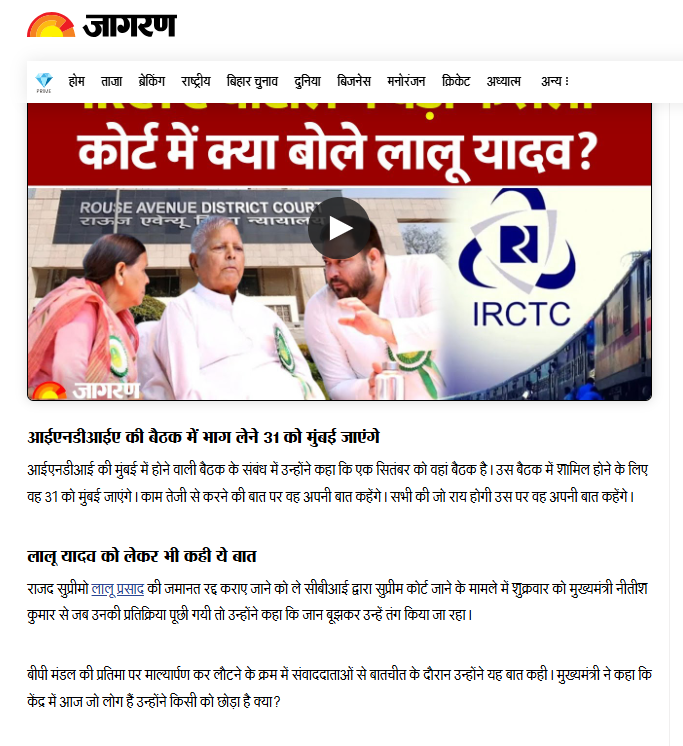 इसके अलावा, हमें दैनिक जागरण की वेबसाइट पर भी 25 अगस्त 2023 को प्रकाशित रिपोर्ट मिली. इस रिपोर्ट में भी बताया गया था कि 25 अगस्त को बीपी मंडल की प्रतिमा पर माल्यार्पण करके लौटने समय पत्रकारों से बातचीत के दौरान नीतीश कुमार ने राजद सुप्रीमो की जमानत रद्द कराने को लेकर सीबीआई के सुप्रीम कोर्ट जाने पर प्रतिक्रिया दी थी. उन्होंने कहा था कि जान-बूझकर उन्हें तंग किया जा रहा.