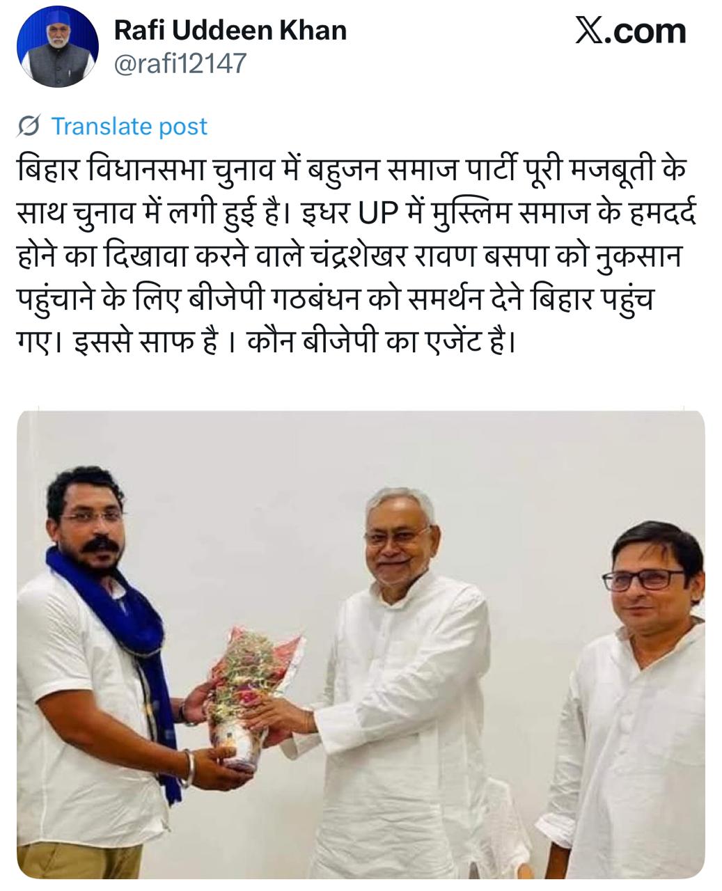 एक्स पर एक यूज़र ने तस्वीर पोस्ट करते हुए लिखा, “बिहार विधानसभा चुनाव में बहुजन समाज पार्टी पूरी मजबूती के साथ चुनाव में लगी हुई है। इधर UP में मुस्लिम समाज के हमदर्द होने का दिखावा करने वाले चंद्रशेखर रावण बसपा को नुकसान पहुंचाने के लिए बीजेपी गठबंधन को समर्थन देने बिहार पहुंच गए, इससे साफ है. कौन बीजेपी का एजेंट है.” पोस्ट का आर्काइव यहां देखें.