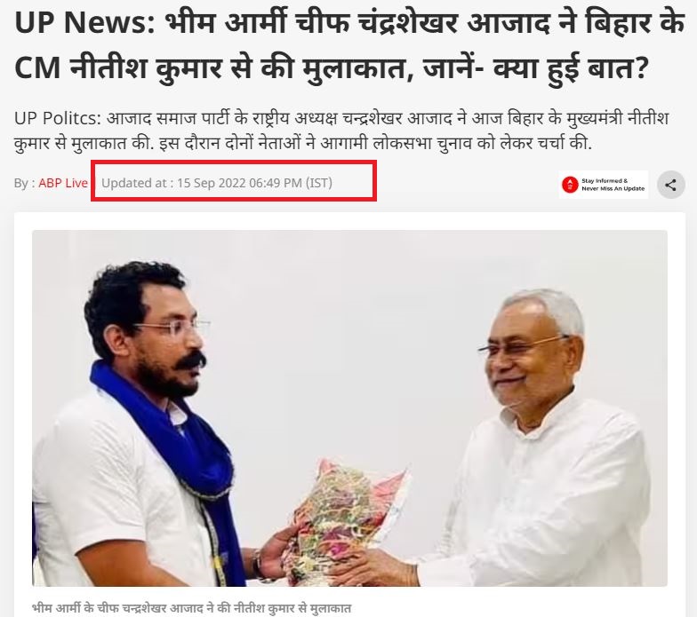 बिहार के मुख्यमंत्री नीतीश कुमार और भीम आर्मी चीफ़ चंद्रशेखर आज़ाद की हालिया मुलाकात की बताकर शेयर की जा रही तस्वीर को रिवर्स इमेज सर्च करने पर हमें यह 15 सितंबर 2022 की एबीपी न्यूज़ की रिपोर्ट में मिली. इससे साफ़ होता है कि यह एक पुरानी तस्वीर है.