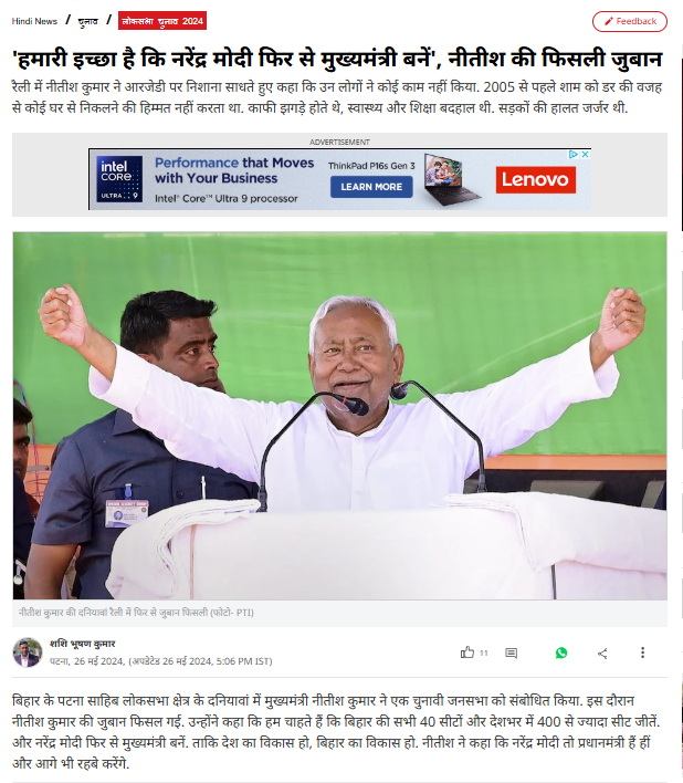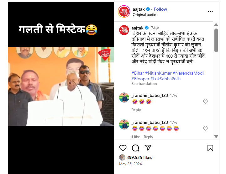 इसके अलावा, हमें इस संबंध में आजतक की वेबसाइट पर 26 मई 2024 को प्रकाशित रिपोर्ट भी मिली. रिपोर्ट में बताया गया था कि पटना साहिब लोकसभा क्षेत्र के दनियावां में चुनावी जनसभा को संबोधित करने के दौरान मुख्यमंत्री नीतीश कुमार की जुबान फिसल गई थी. उन्होंने यह कह दिया था कि “हम चाहते हैं कि बिहार की सभी 40 सीटों और देशभर में 400 से ज्यादा सीट जीतें और नरेंद्र मोदी फिर से मुख्यमंत्री बनें. ताकि देश का विकास हो और बिहार का विकास हो.”