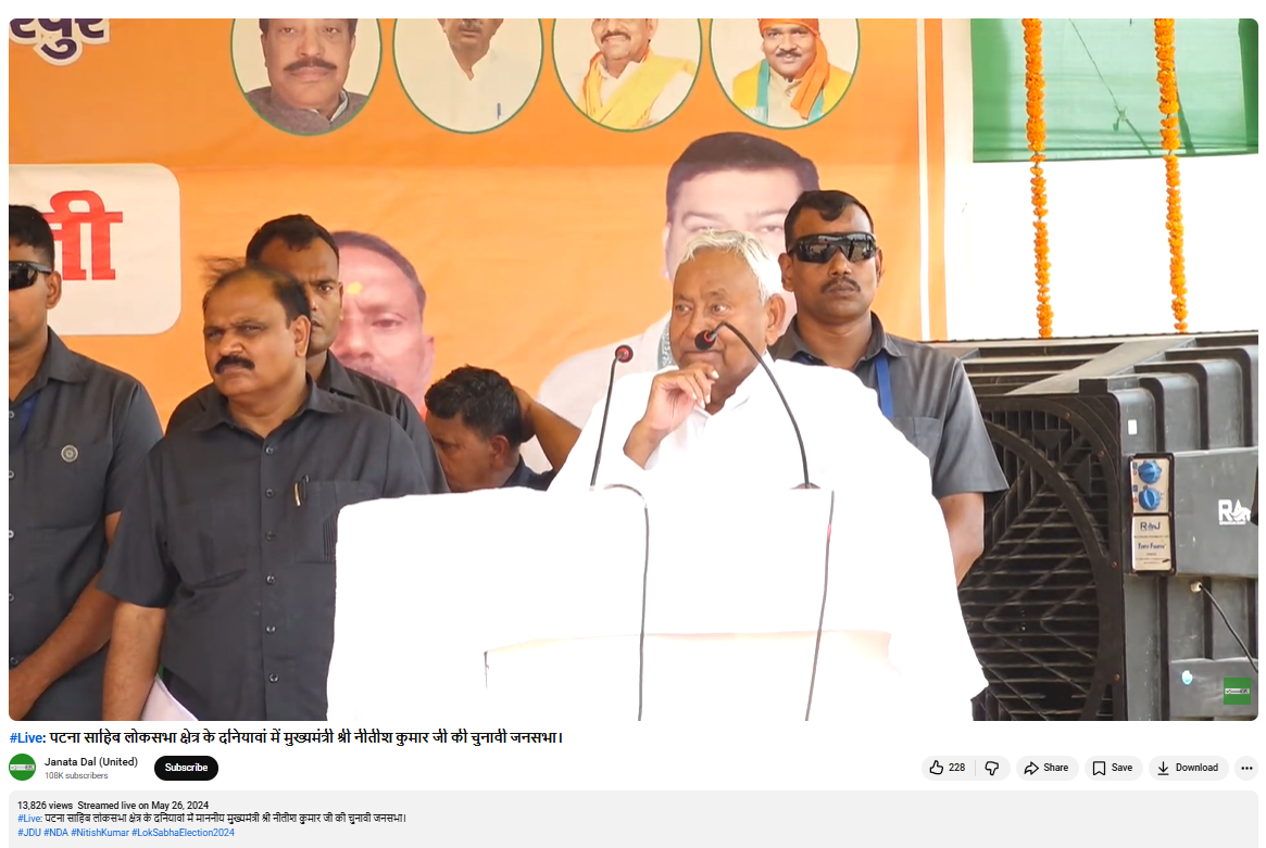 जांच में हमें नीतीश कुमार के इस भाषण का पूरा वीडियो उनकी पार्टी जदयू के यूट्यूब अकाउंट से 26 मई 2024 को लाइव किया गया मिला. करीब 44 मिनट के इस वीडियो में हमें करीब 42 मिनट से वायरल वीडियो वाला हिस्सा मिला. यह जनसभा मुख्यमंत्री नीतीश कुमार ने पटना साहिब के लोकसभा प्रत्याशी रविशंकर प्रसाद के लिए की थी.