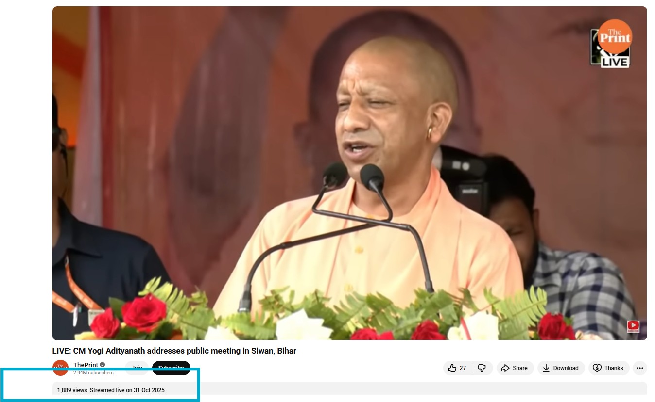 वायरल वीडियो के कीफ्रेम्स को रिवर्स इमेज सर्च करने पर द प्रिंट का एक यूट्यूब लाइवस्ट्रीम मिला, जिसका वॉटरमार्क वायरल क्लिप में दिखाई देता है. यह 31 अक्टूबर, 2025 को रिकॉर्ड किया गया था, जिसमें सीएम योगी आदित्यनाथ बिहार के सिवान में एक रैली को संबोधित करते हुए दिखाई दे रहे थे, यानी 10 नवंबर, 2025 को दिल्ली ब्लास्ट से काफी पहले. इसमें मुख्यमंत्री उसी बैकग्राउंड में रैली को संबोधित करते हुए दिखाई दे रहे थे, जैसा वायरल क्लिप में दिखाई दे रहा है.