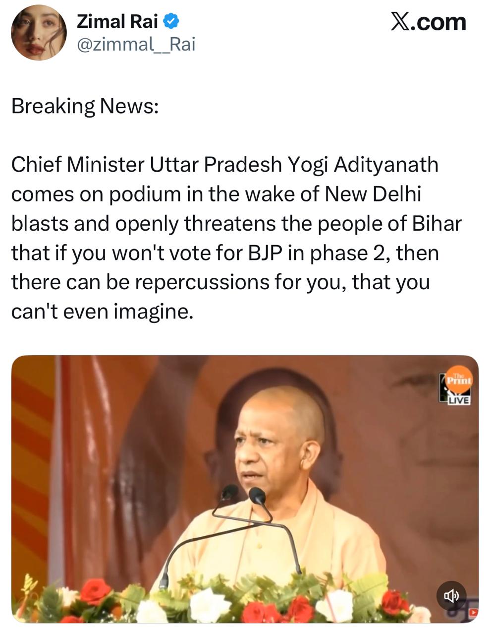 इस घटना के बाद, उत्तर प्रदेश के मुख्यमंत्री योगी आदित्यनाथ का एक वीडियो सोशल मीडिया पर वायरल है, जिसमें कथित तौर पर वह बिहार के मतदाताओं को बीजेपी का समर्थन करने या फिर दिल्ली ब्लास्ट जैसा अंजाम भुगतने की चेतावनी देते हुए नज़र आ रहे हैं.