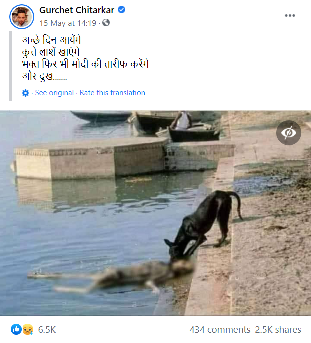 देश में संक्रमण की स्थिति का अंदाजा इसी बात से लगाया जा सकता है कि पिछले कई दिनों से विभिन्न नदियों में शवों के तैरने की खबरें आ रही हैं. कई ऐसे मामले भी प्रकाश में आये हैं जहां मृतक का शव जानवरों द्वारा क्षतिग्रस्त कर दिया गया था. कई नदियों में इतने व्यापक पैमाने पर शव देखे गए, जिससे स्थानीय लोगों को अन्य बीमारियों का खतरा भी हो सकता है. इसी क्रम में सोशल मीडिया पर एक तस्वीर शेयर कर इसे कोरोना संक्रमण काल के दौरान स्वास्थ्य सुविधाओं की बदतर व्यवस्था से संबंधित बताया गया. वायरल तस्वीर की बात करें तो इसमें कुत्ते द्वारा इंसान का शव खाने का वीभत्स दृश्य देखा जा सकता है. वायरल दावा फेसबुक पर तेजी से वायरल हो रहा है.