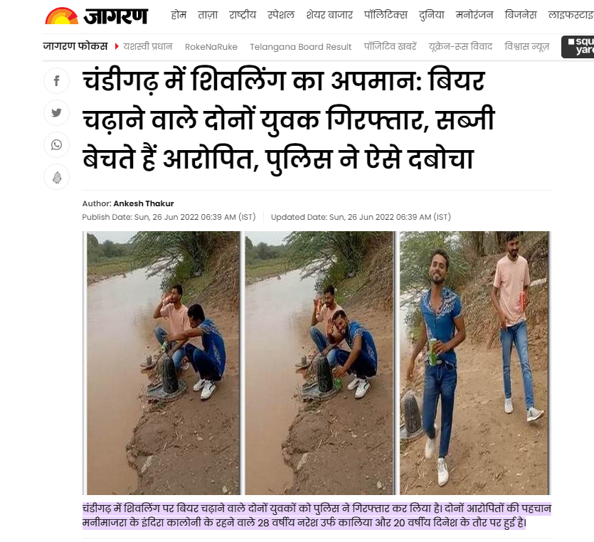 वायरल दावे की सत्यता जानने के लिए हमने कुछ कीवर्ड की मदद से गूगल पर सर्च किया। हमें दैनिक जागरण द्वारा 26 जून, 2022 को प्रकाशित एक रिपोर्ट प्राप्त हुई। रिपोर्ट के मुताबिक, चंडीगढ़ के आईटी पार्क थाना क्षेत्र में तालाब किनारे दो युवकों द्वारा शिवलिंग पर बियर चढ़ाने का मामला सामने आया था। दोनों आरोपियों के खिलाफ हिंदू संगठनों ने शिकायत दर्ज कराई थी, जिसके बाद युवकों का गिरफ्तार कर लिया गया है। बतौर रिपोर्ट, दोनों आरोपी एक ही समुदाय के हैं।