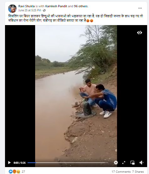 सोशल मीडिया पर एक वीडियो शेयर कर दावा किया गया है कि धर्म विशेष के लोग शिवलिंग पर बियर चढ़ाकर हिंदुओं की भावना को भड़का रहे हैं। वायरल वीडियो में दो युवक एक बोतल से शिवलिंग पर कुछ चढ़ाते हुए नज़र आ रहे हैं।