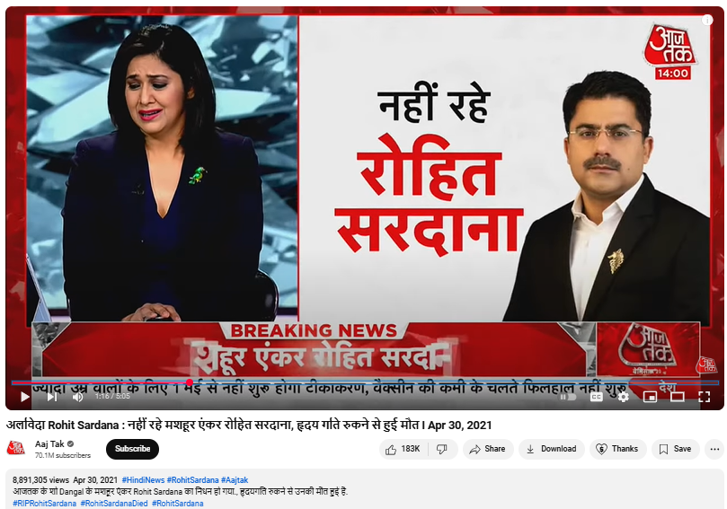 इस वीडियो में एंकर नवजोत रंधावा रोते हुए आजतक के एंकर रहे रोहित सरदाना के निधन की खबर दे रहीं थीं. एंकर रोहित सरदाना की साल 2021 में हृदयगति रूकने से मौत हो गई थी. हालांकि, इस पूरे वीडियो में उन्होंने कहीं भी डायबिटीज या डॉ नरेश त्रेहन का ज़िक्र नहीं किया था. वायरल वीडियो वाला हिस्सा इसी वीडियो रिपोर्ट से लिया गया है, जिसे आप नीचे मौजूद तस्वीरों से समझ सकते हैं.