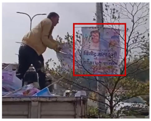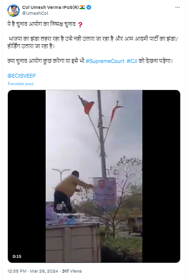 इसी बीच एक वीडियो वायरल है, जिसमें नज़र आ रहा है कि खंभों पर लगे किसी प्रत्याशी के पोस्टर हटाए जा रहे हैं, जबकि भाजपा के झंडे खंभों पर लगे हुए हैं। इस वीडियो को शेयर कर कहा जा रहा है कि ”ये है चुनाव आयोग का निष्पक्ष चुनाव, भाजपा का झंडा लहरा रहा है उसे नहीं उतारा जा रहा है और आम आदमी पार्टी का झंडा/होर्डिंग उतारा जा रहा है। क्या चुनाव आयोग कुछ करेगा या इसे भी #SupremeCourt #CJI को देखना पड़ेगा।” साथ में चुनाव आयोग के आधिकारिक हैंडल को टैग किया गया है।