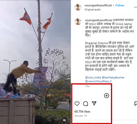 एनएसयूआई के इंस्टाग्राम पोस्ट के कैप्शन में सूबे की सरकार पर निशाना साधते हुए लिखा गया है कि भजनलाल सरकार एनएसयूआई प्रदेश अध्यक्ष विनोद जाखड़ के जयपुर आगमन पर डर गई है, जिसके चलते सरकार द्वारा उनके पोस्टर्स उतरवाए जा रहे हैं। वीडियो को ज़ूम करके देखने पर भी हमने पाया कि पोस्टर पर विनोद जाखड़ लिखा हुआ है।