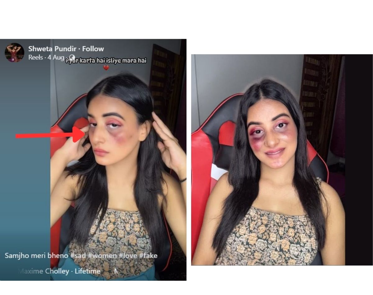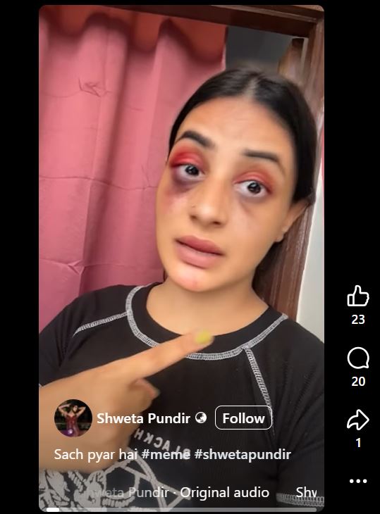 वायरल तस्वीर को गूगल लेंस से सर्च करने पर पता चला कि यह तस्वीर डिजिटल कंटेंट क्रिएटर श्वेता पुंडीर की है, जिन्होंने इसे अपने फ़ेसबुक अकाउंट पर 1 अगस्त 2025 को पोस्ट किया था. उन्होंने इस तस्वीर को हार्ट इमोजी के साथ ‘प्यार करता है तभी तो मारता है’ कैप्शन देते हुए शेयर किया था.