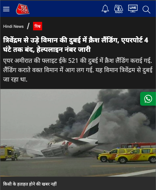 Google Search के दौरान मिले एक लेख के मुताबिक यह तस्वीर साल 2016 में दुबई एयरपोर्ट पर ली गई थी, जब भारत के तिरुवनंतपुरम से दुबई जा रहा अमीरात एयरलाइन का एक विमान दुबई के हवाई अड्डे पर दुर्घटनाग्रस्त हो गया था। इस हादसे में सभी 282 यात्रियों और चालक दल के 18 सदस्यों को सुरक्षित निकाल लिया गया था।