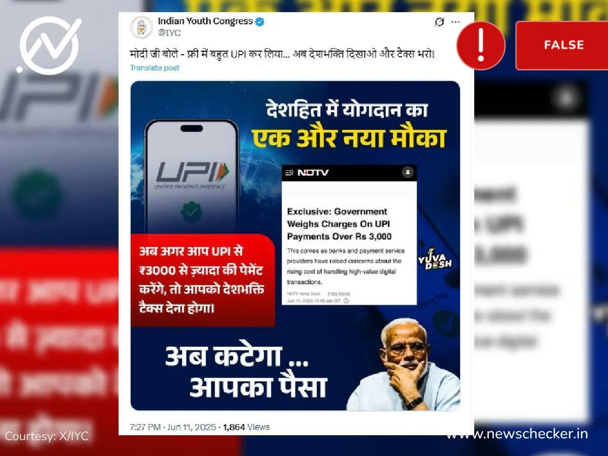 सोशल मीडिया पर एक पोस्ट के जरिए दावा किया गया कि अब 3000 रुपए से ज्यादा के UPI पेमेंट पर चार्ज लगेगा। हमारी जांच में यह दावा फर्जी निकला। फैक्ट चेक यहां पढ़ें।