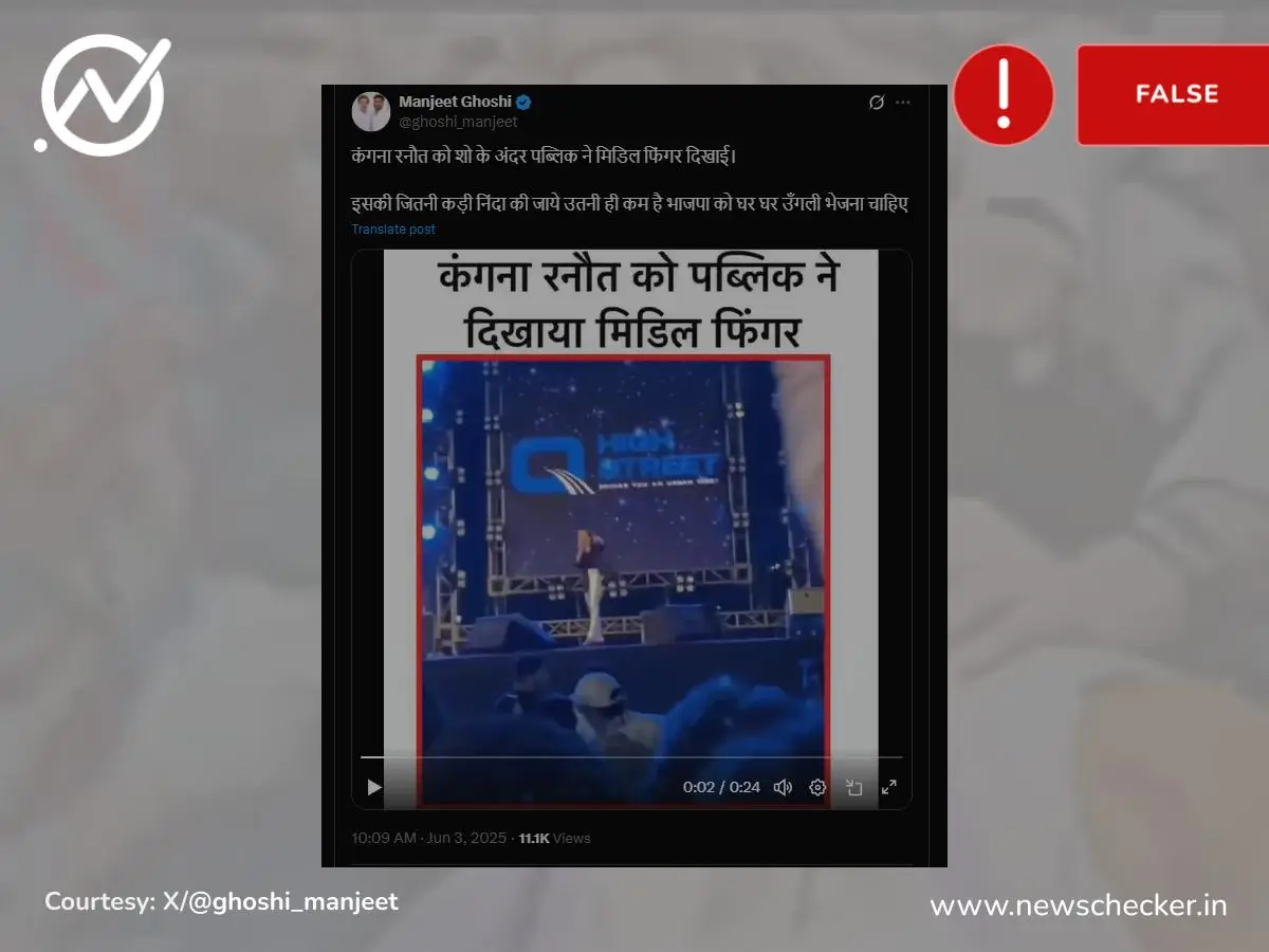 सोशल मीडिया पर एक वीडियो शेयर कर दावा किया गया एक स्टेज शो के दौरान भीड़ में मौजूद कुछ लोगों ने कंगना रनौत को मिडिल फिंगर दिखाई। हमारी जांच में यह दावा फर्जी साबित हुआ। फैक्ट चेक यहां पढ़ें।