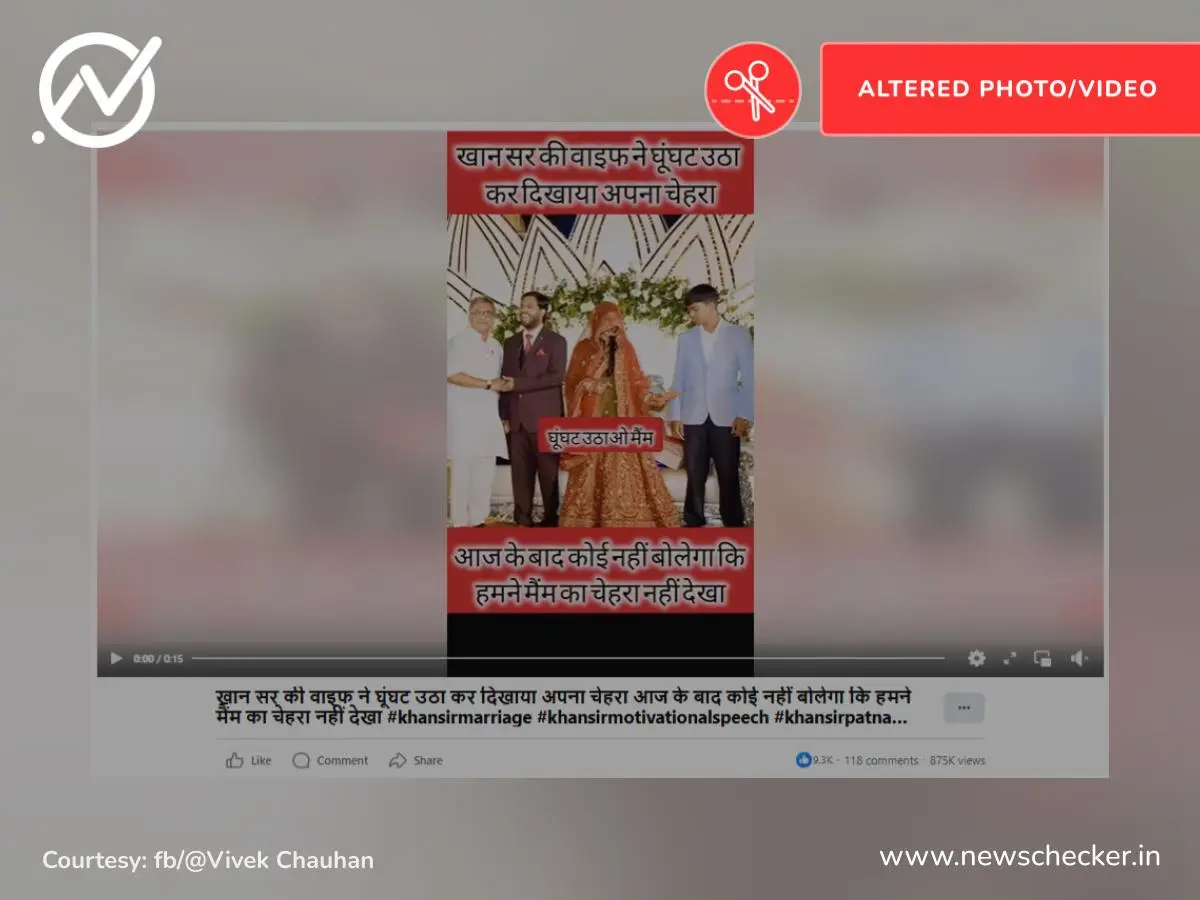 एक वीडियो को शेयर कर कई सोशल मीडिया यूजर्स ने दावा किया कि वेडिंग रिसेप्शन के दौरान खान सर की वाइफ ने स्टेज पर अपना घूंघट उठा दिया। हमारी पड़ताल में यह दावा फर्जी साबित हुआ। फैक्ट चेक यहां पढ़ा जा सकता है।