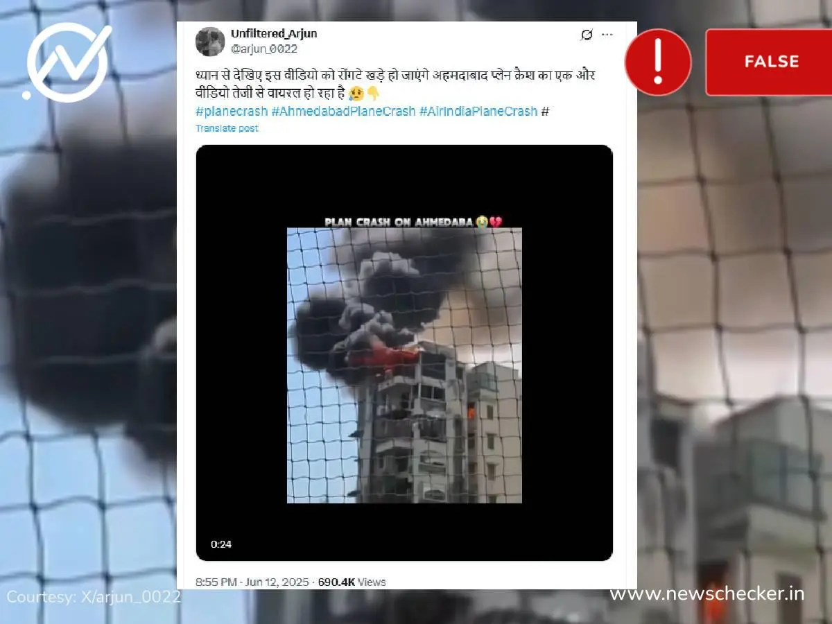 एक इमारत में लगी आग और वहां से छलांग लगाते लोगों का एक वीडियो सोशल मीडिया पर वायरल हो गया। इस वीडियो को अहमदाबाद विमान हादसे से जोड़कर शेयर किया जाने लगा। हालांकि, हमारी पड़ताल में यह दावा फर्जी साबित हुआ। फैक्ट चेक यहां पढ़ें।