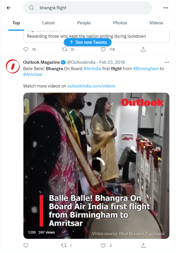वायरल वीडियो के बारे में अधिक जानकारी के लिए हमने ट्विटर पर ‘bhangra flight’ कीवर्ड्स को ढूंढा, जहां हमें Outlook Magazine द्वारा 23 फ़रवरी, 2018 को शेयर किये गए एक ट्वीट में वायरल वीडियो प्राप्त हुआ.