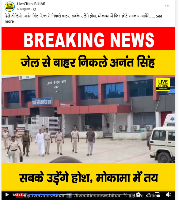 वीडियो के साथ मौजूद कैप्शन में लिखा हुआ था, “मोकामा के पूर्व विधायक अनंत सिंह जेल से आए बाहर. सोनू-मोनू गैंग से भिड़ंत के बाद किया था सरेंडर. समर्थकों ने ढोल नगाड़ों के साथ किया स्वागत. पटना हाई कोर्ट से उन्हें इस मामले में बेल मिली थी”.