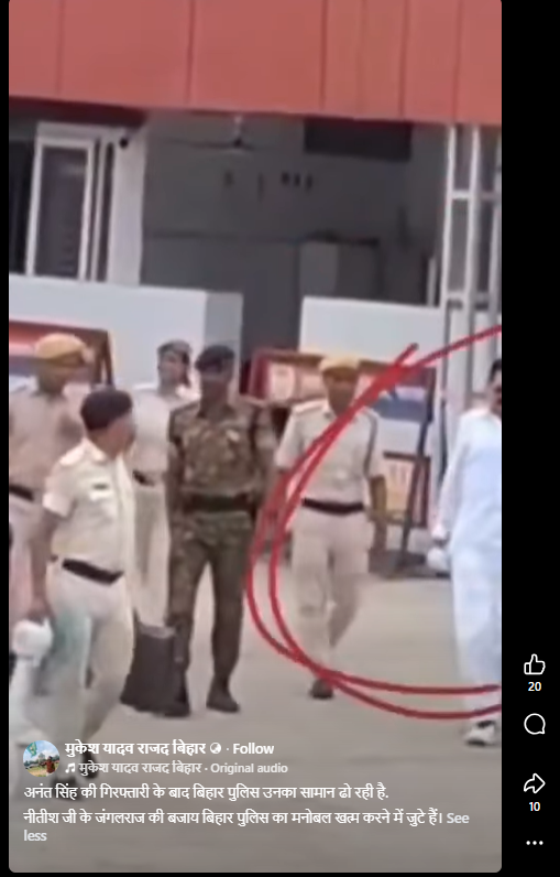 वीडियो को X पर वायरल दावे वाले कैप्शन के साथ शेयर किया गया है, जिसमें लिखा हुआ है “अनंत सिंह की गिरफ्तारी के बाद बिहार पुलिस सामान ढो रही है. नीतीश कुमार जंगलराज की बजाय बिहार पुलिस का मनोबल खत्म करने में जुटे हैं. देख रहे हो न बिहारवालों? “