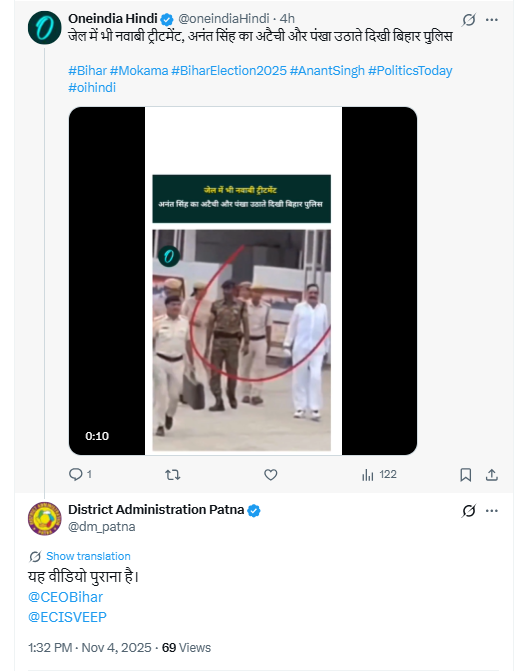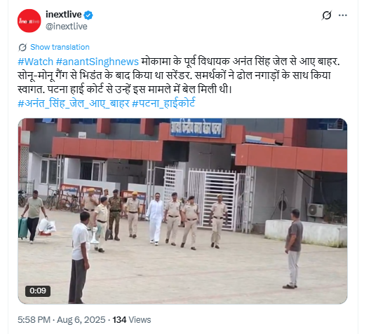अनंत सिंह की गिरफ्तारी के बाद बिहार पुलिस द्वारा उनका सामान ढोए जाने के दावे से वायरल वीडियो की पड़ताल के दौरान, रिवर्स इमेज सर्च करने पर इस वीडियो से जुड़े दृश्य आईनेक्स्ट लाइव के X अकाउंट से 6 अगस्त 2025 को पोस्ट किए गए वीडियो में मिले.
