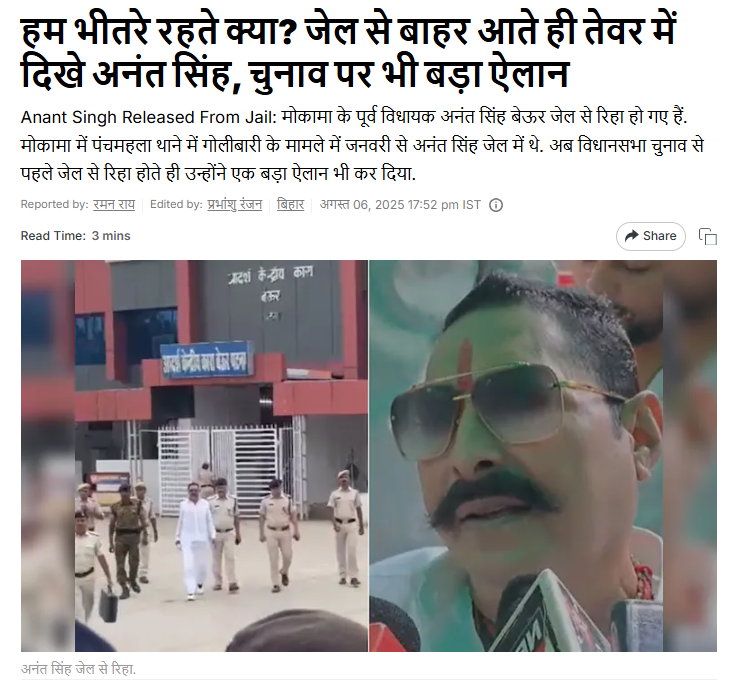 इतना ही नहीं, हमें एनडीटीवी इंडिया की वेबसाइट पर प्रकाशित रिपोर्ट में भी इससे जुड़ी तस्वीर मिली. रिपोर्ट में बताया गया था कि जनवरी 2025 में मोकामा में पंचमहला थाना क्षेत्र में गोलीबारी हुई थी. यह गोलीबारी अनंत सिंह और सोनू-मोनू गिरोह के बीच हुई थी. जिसके बाद सोनू-मोनू के साथ-साथ अनंत सिंह को भी जेल भेजा गया था. वे पटना के बेउर जेल में बंद थे और उन्हें अगस्त महीने में जेल से रिहा किया गया था.